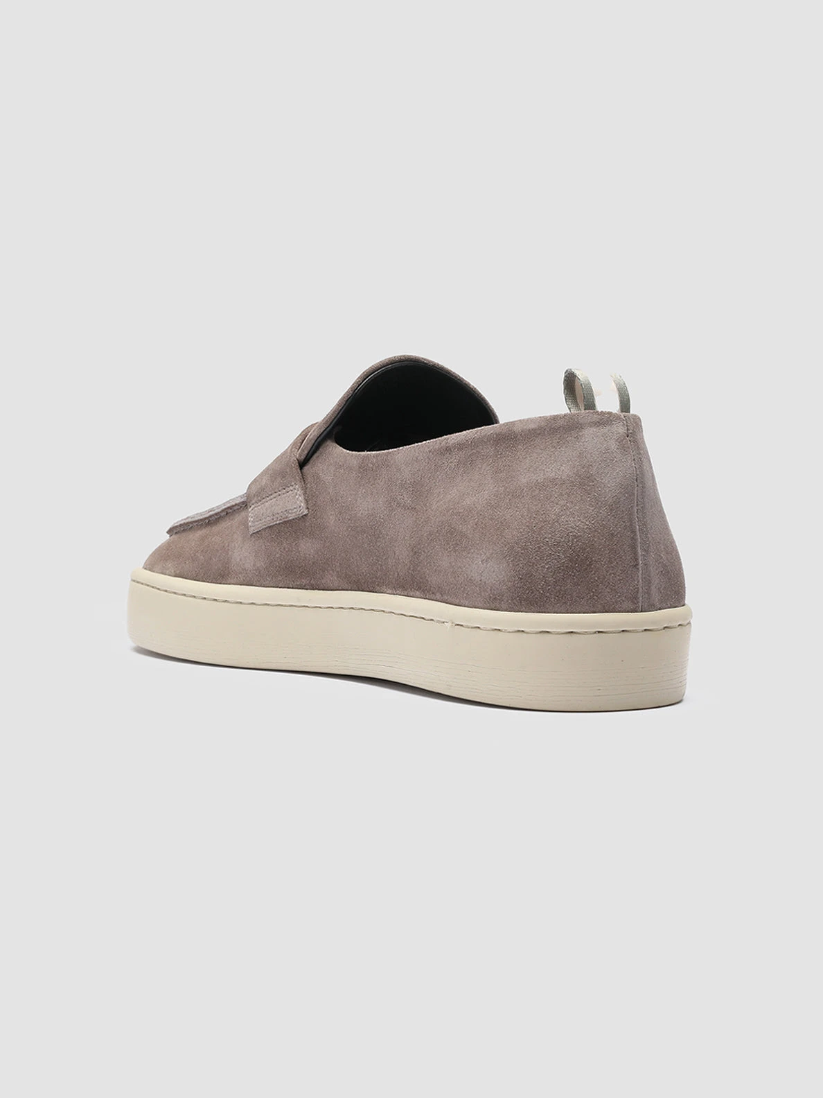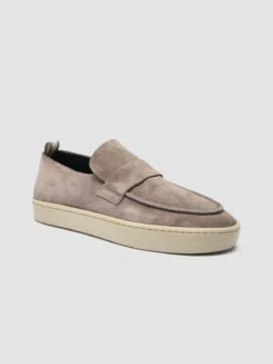 A sporty feel contemporary style distinguishes our Bug penny loafers in supple dove-grey suede. Carefully crafted by our artisans they feature a white natural rubber sole a rounded almond toe highlighted by flawless tone-on-tone stitching and our signature grosgrain heel loop-tab.