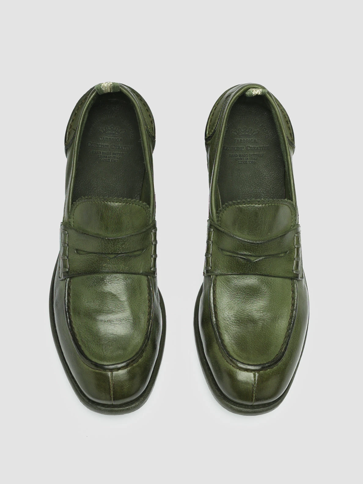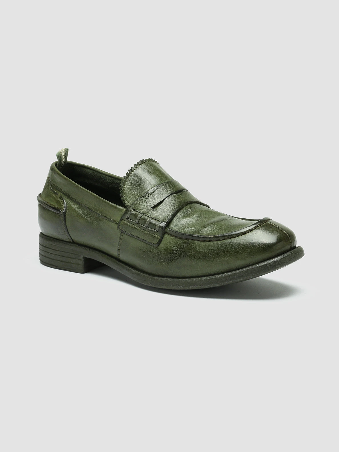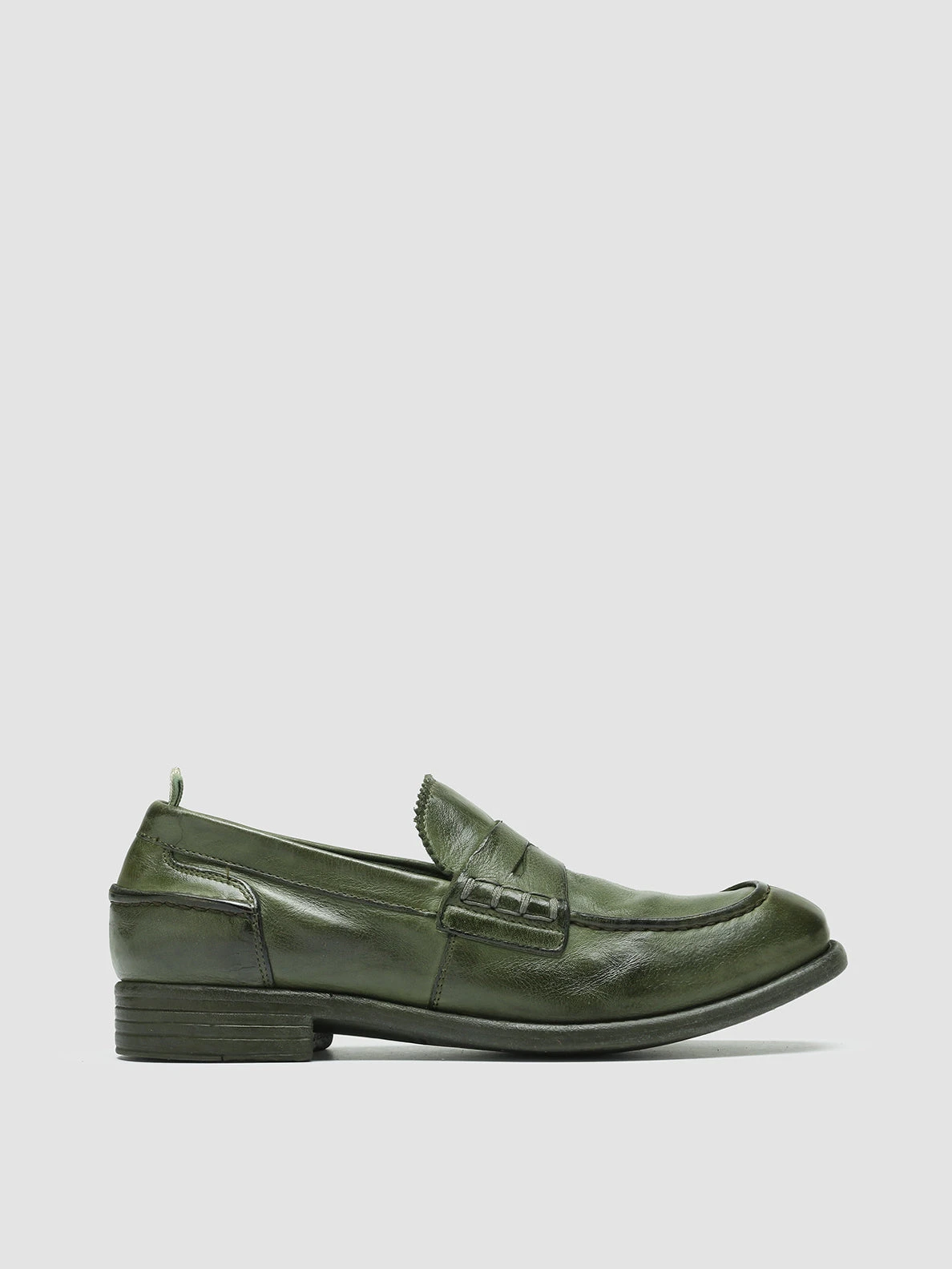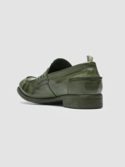 Versatile and comfortable, our Calixte penny loafers reveal a refined vintage vibes artisan design. They are handcrafted from fine military green leather and feature flawless tone-on-tone stitching, a rounded tongue with a zig-zag edge, signature grosgrain back loop tab and a rubber sole with a non-slip bottom and a stacked heel.