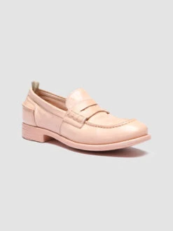 Versatile and comfortable, our Calixte penny loafers reveal a refined vintage vibes artisan design. They are handcrafted from fine pink leather and feature flawless tone-on-tone stitching, a rounded tongue with a zig-zag edge, signature grosgrain back loop tab and a rubber sole with a non-slip bottom and a stacked heel.