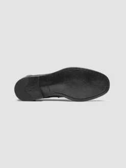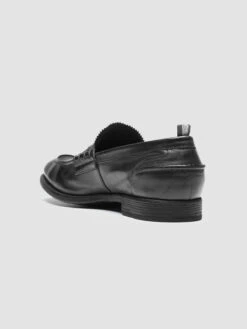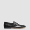 Our Chronicle penny loafers reveal a distinctly handcrafted classic design. Made from premium black leather, they feature a rounded almond toe, flawless tone-on-tone stitching, signature grosgrain heel loop tab and a natural rubber sole with a stacked heel.