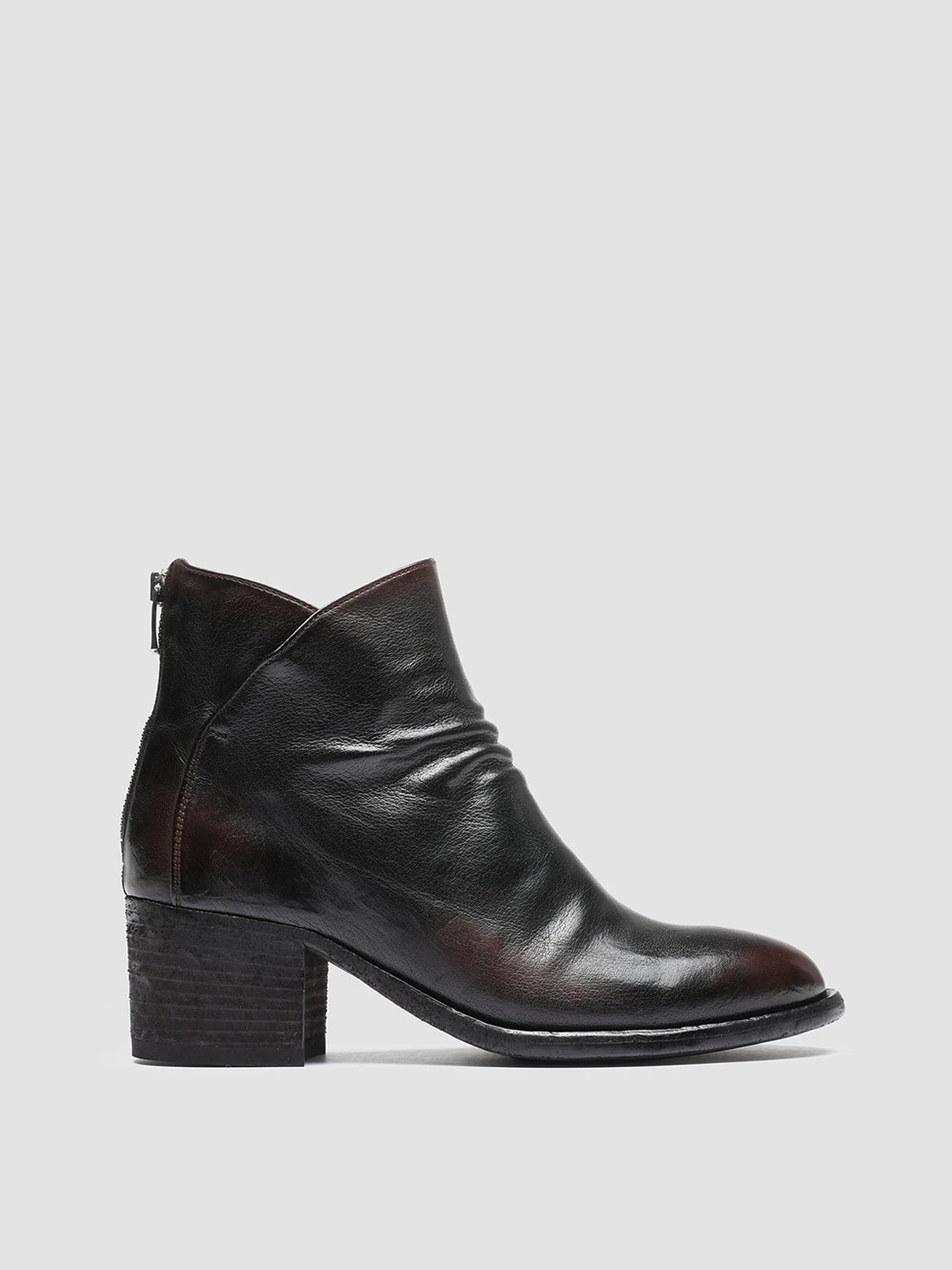 Handcrafted from supple airbrushed leather in shades of dark burgundy and black our Denner ankle boots feature a comfortable and versatile silhouette with a stable midi block heel. They reveal an almond toe soft front pleats a comfortable silver-tone zip fastening at back and a leather sole with non-slip rubber pads.