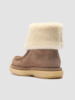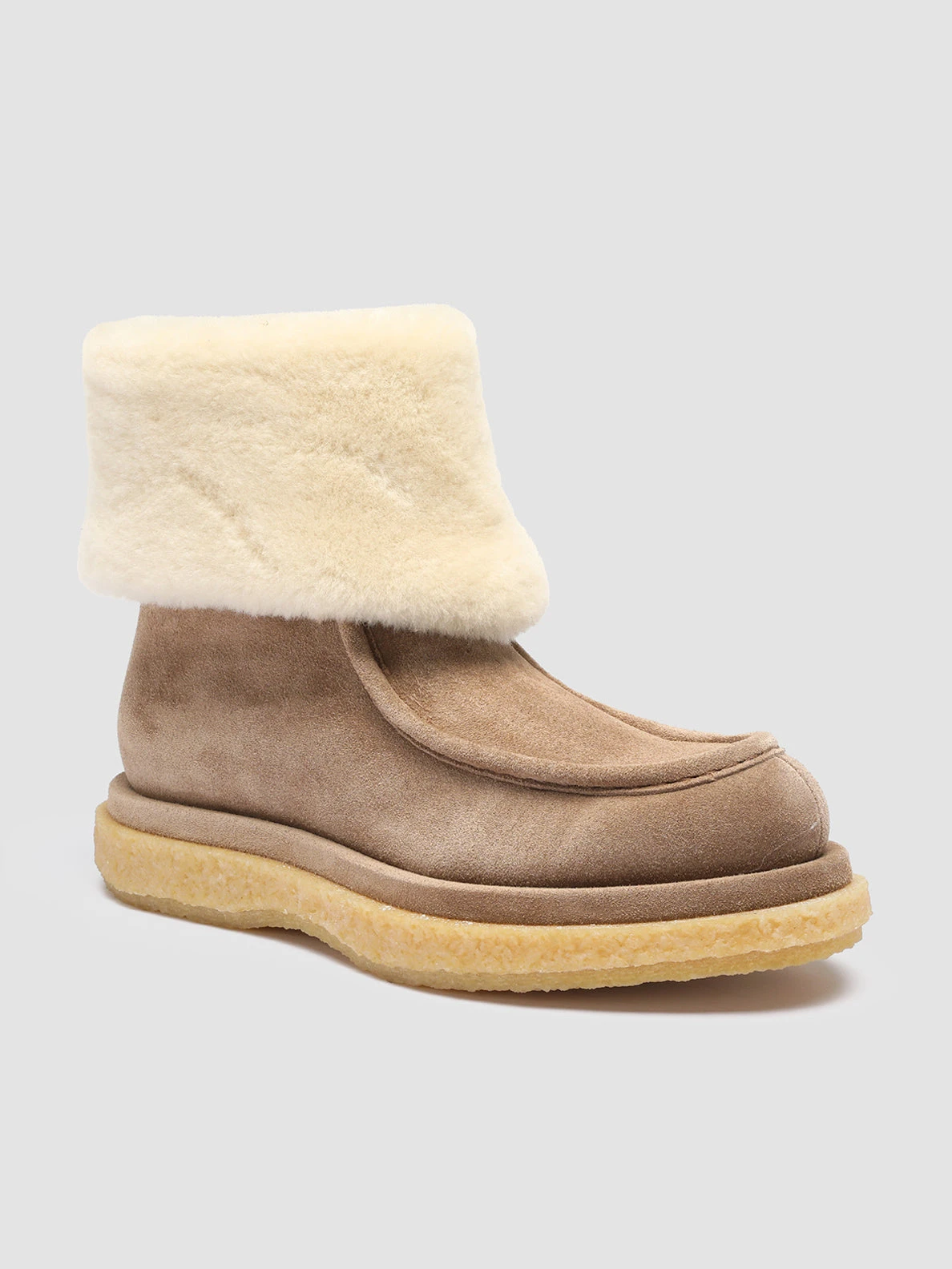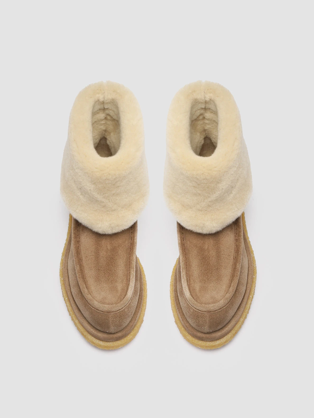 Our comfortable Holyfur ankle boots are ideal for wearing on the coldest days of the season. Expertly handcrafted from tan suede they feature a soft ivory-tone shearling lining and wide lapel a rounded toe highlighted by the embossed seam and a modern casual twist crepe sole.