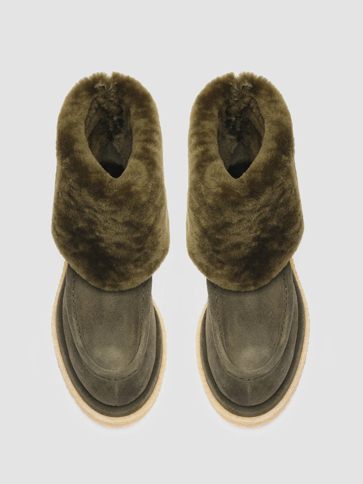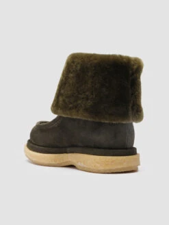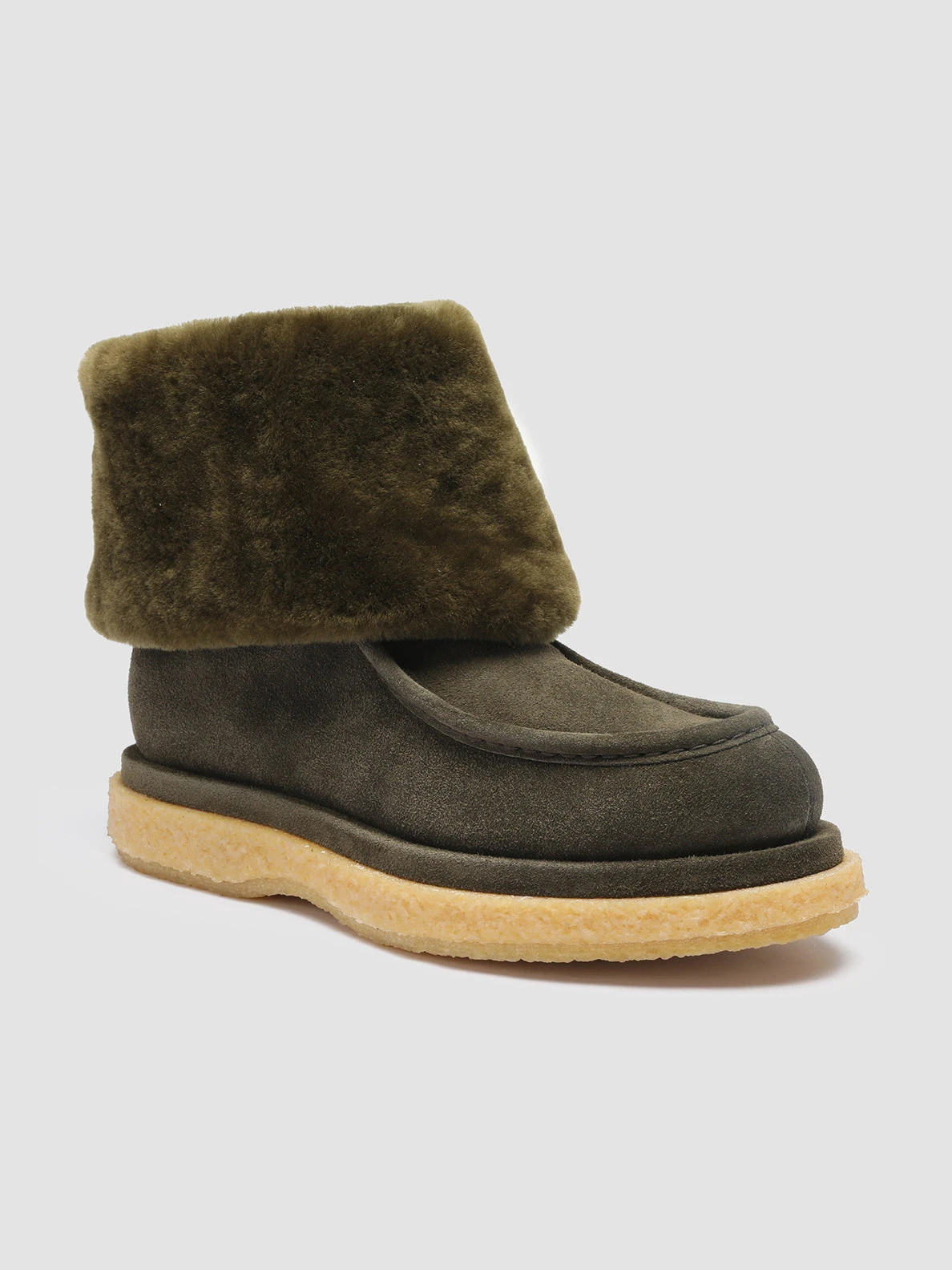 Our comfortable Holyfur ankle boots are ideal for wearing on the coldest days of the season. Expertly handcrafted from khaki green suede they feature a soft tone-on-tone shearling lining and wide lapel a rounded toe highlighted by the embossed seam and a modern casual twist crepe sole.