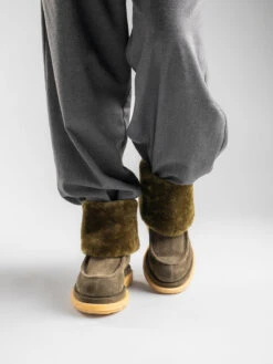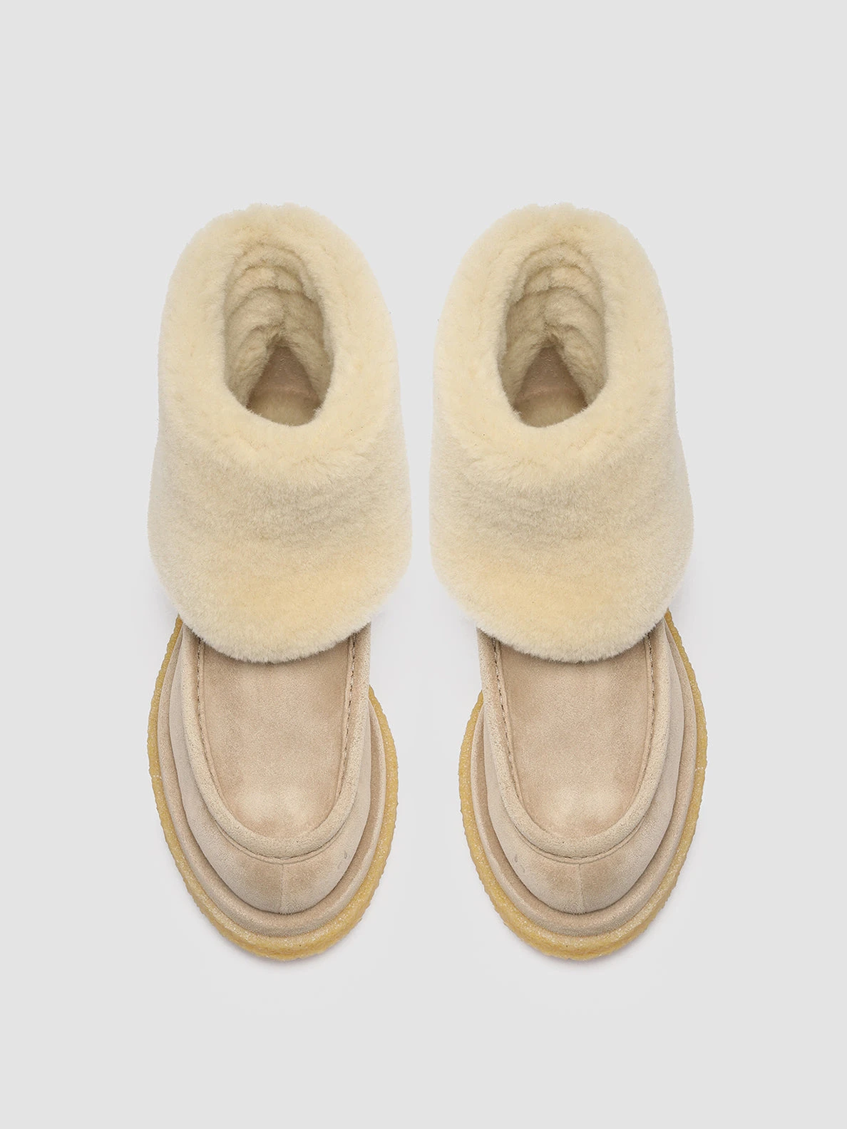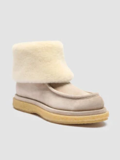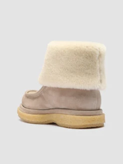 Our comfortable Holyfur ankle boots are ideal for wearing on the coldest days of the season. Expertly handcrafted from nude suede they feature a soft ivory-tone shearling lining and wide lapel a rounded toe highlighted by the embossed seam and a modern casual twist crepe sole.