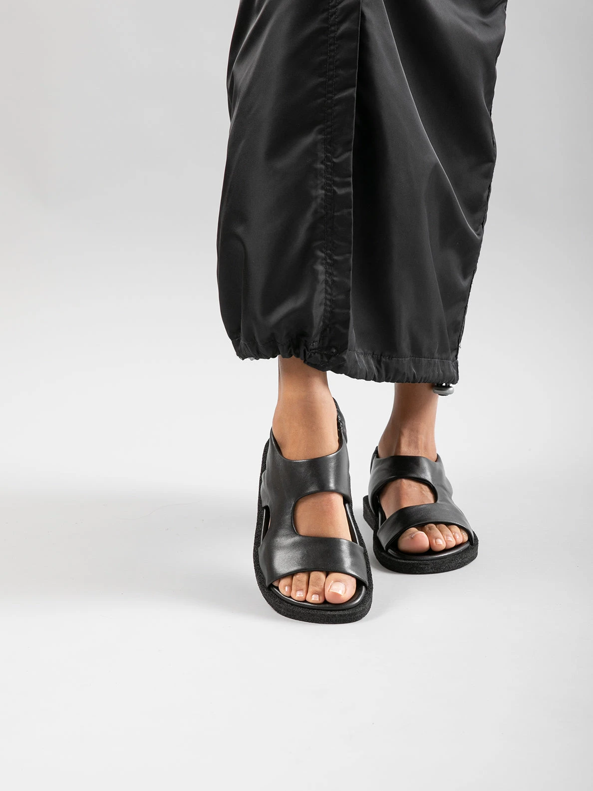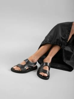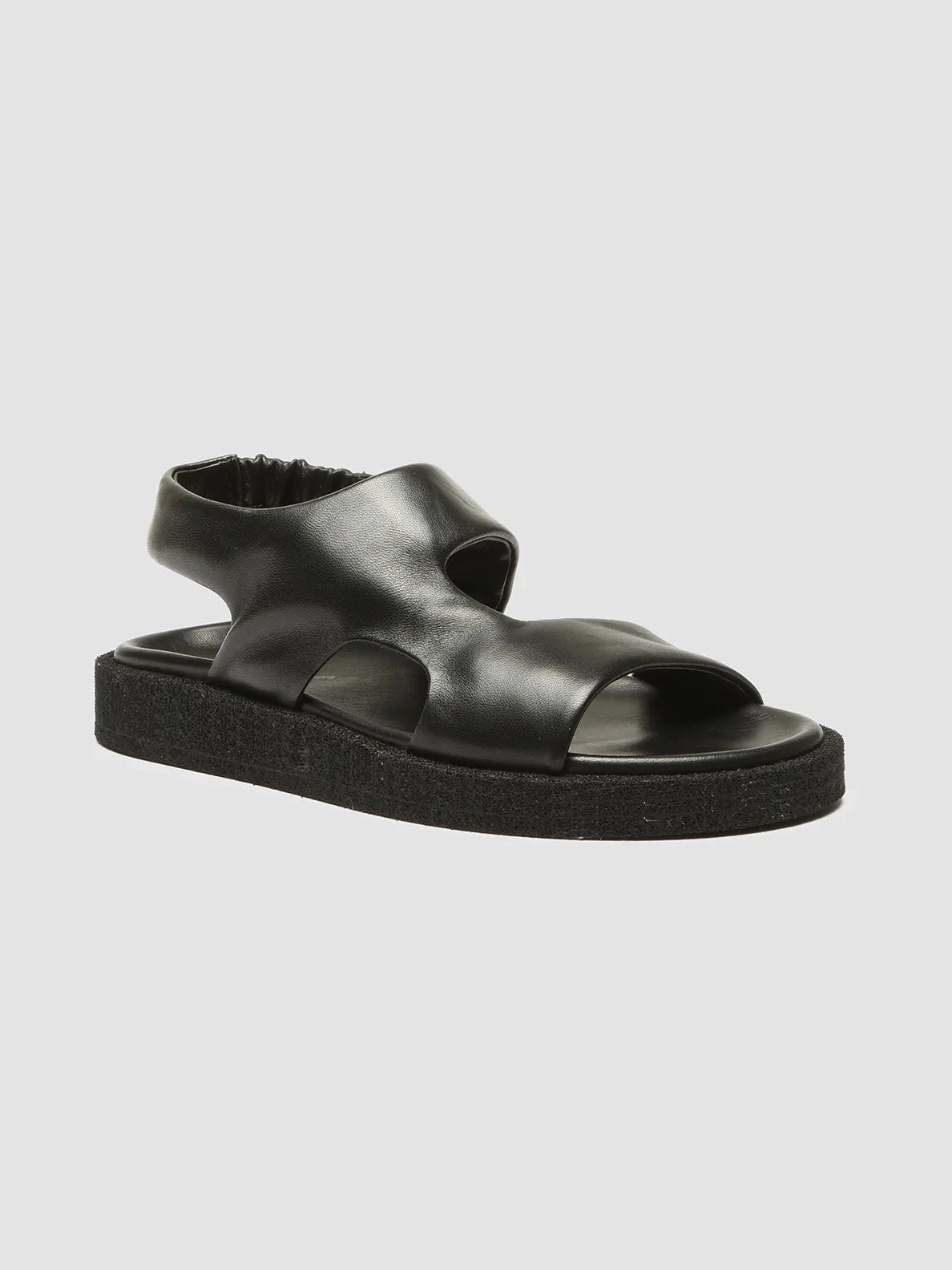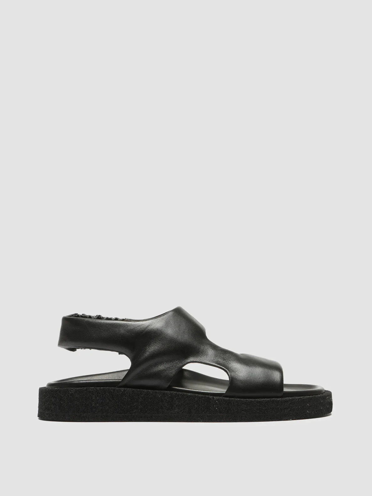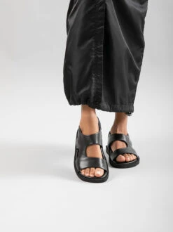 Made entirely by hand from smooth black leather, our Inner sandals feature a comfortable and versatile style with a sporty touch. They feature wraparound straps with an elasticated back strap, molded insole and a flatform rubrex sole.