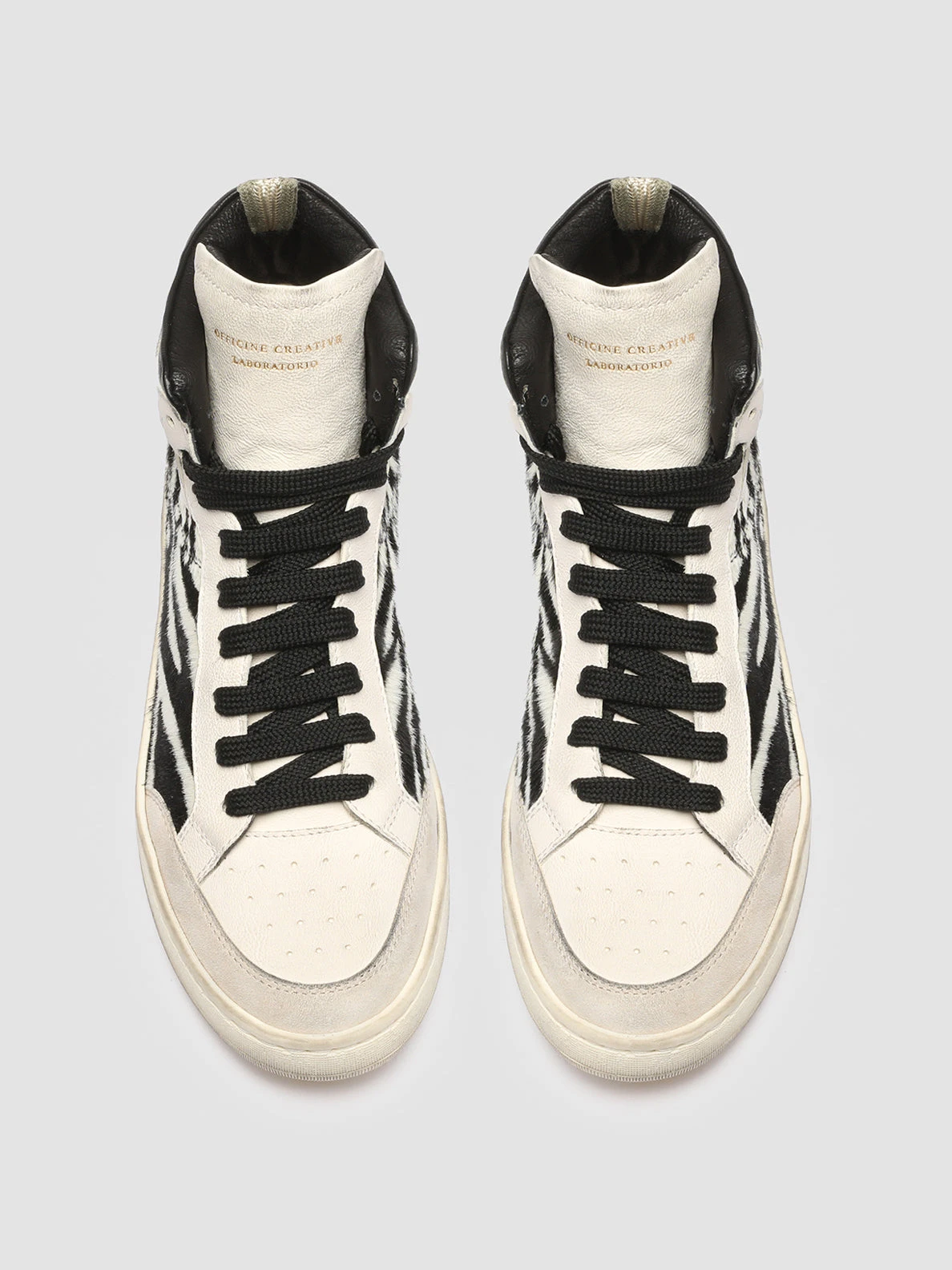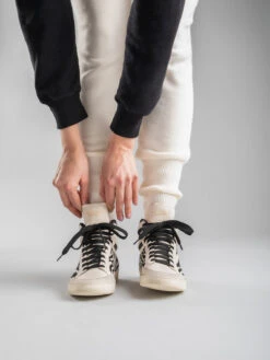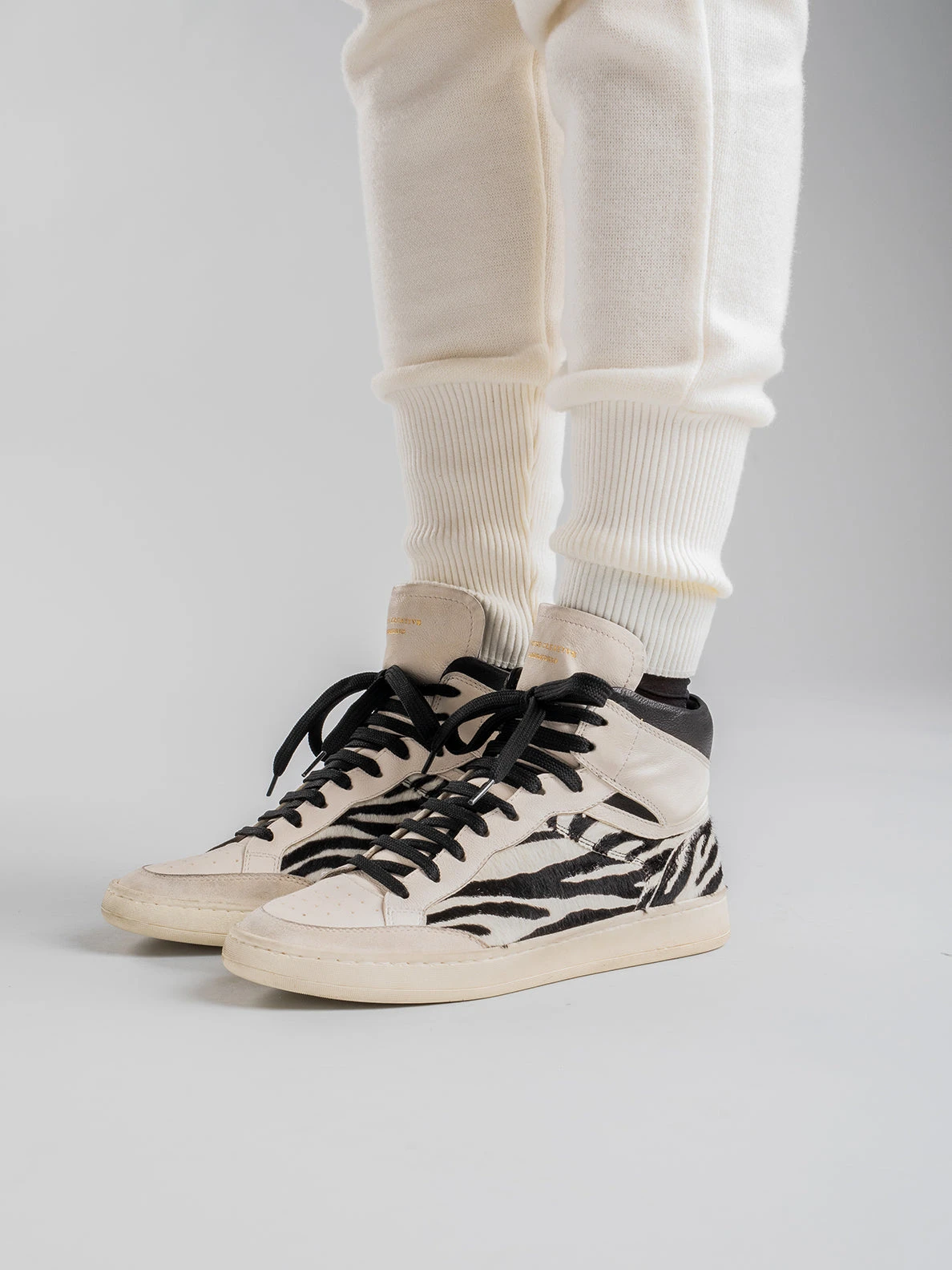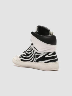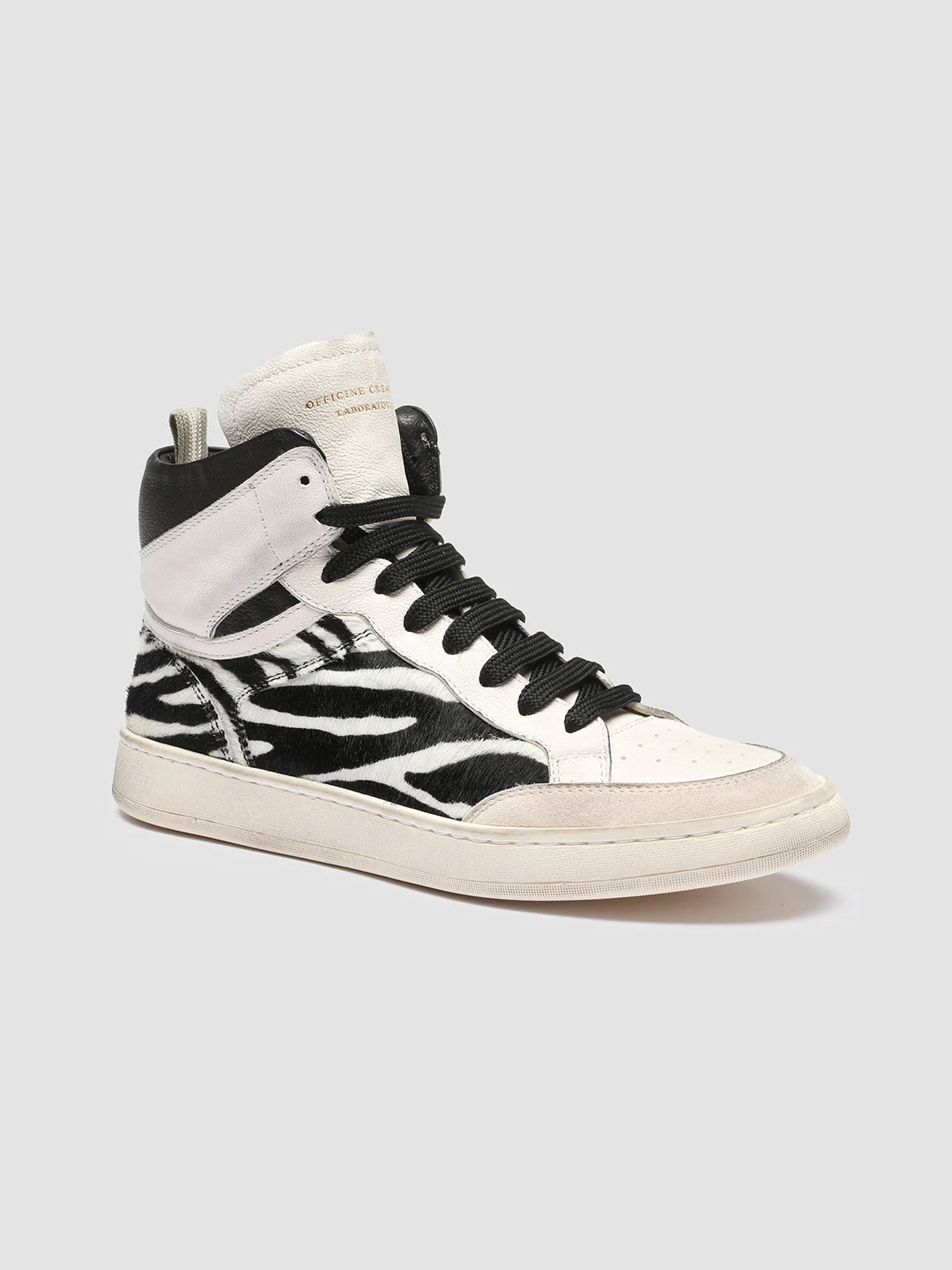 Our Kareem high-top sneakers are marked by a gritty silhouette ready to add a bold touch to your style. They are carefully handcrafted by our artisans and reveal a white soft leather upper zebra-striped pony skin and suede inserts. The padded collar adds extra comfort while the gold-tone lettering logo at the tongue and the natural latex sole complete their style.