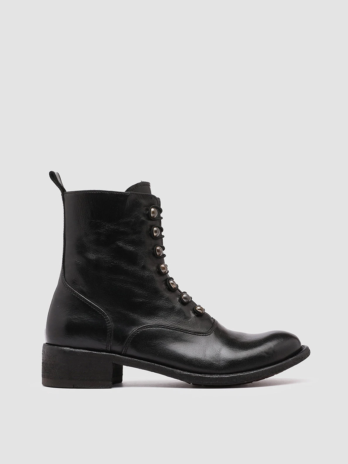 Casual style with sleek notes for our exclusive Lison artisan ankle boots in very high quality black leather. They feature a refined front closure with pearls and elasticated eyelets side zip fastening and a sturdy leather sole with low stacked heel and tread rubber inserts.