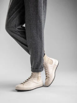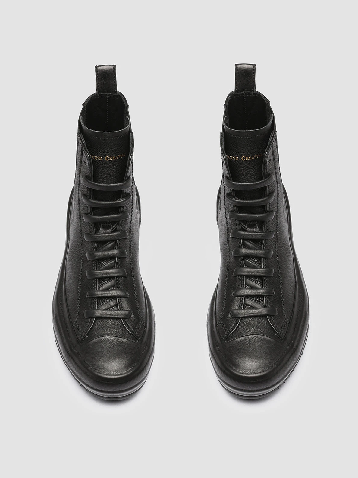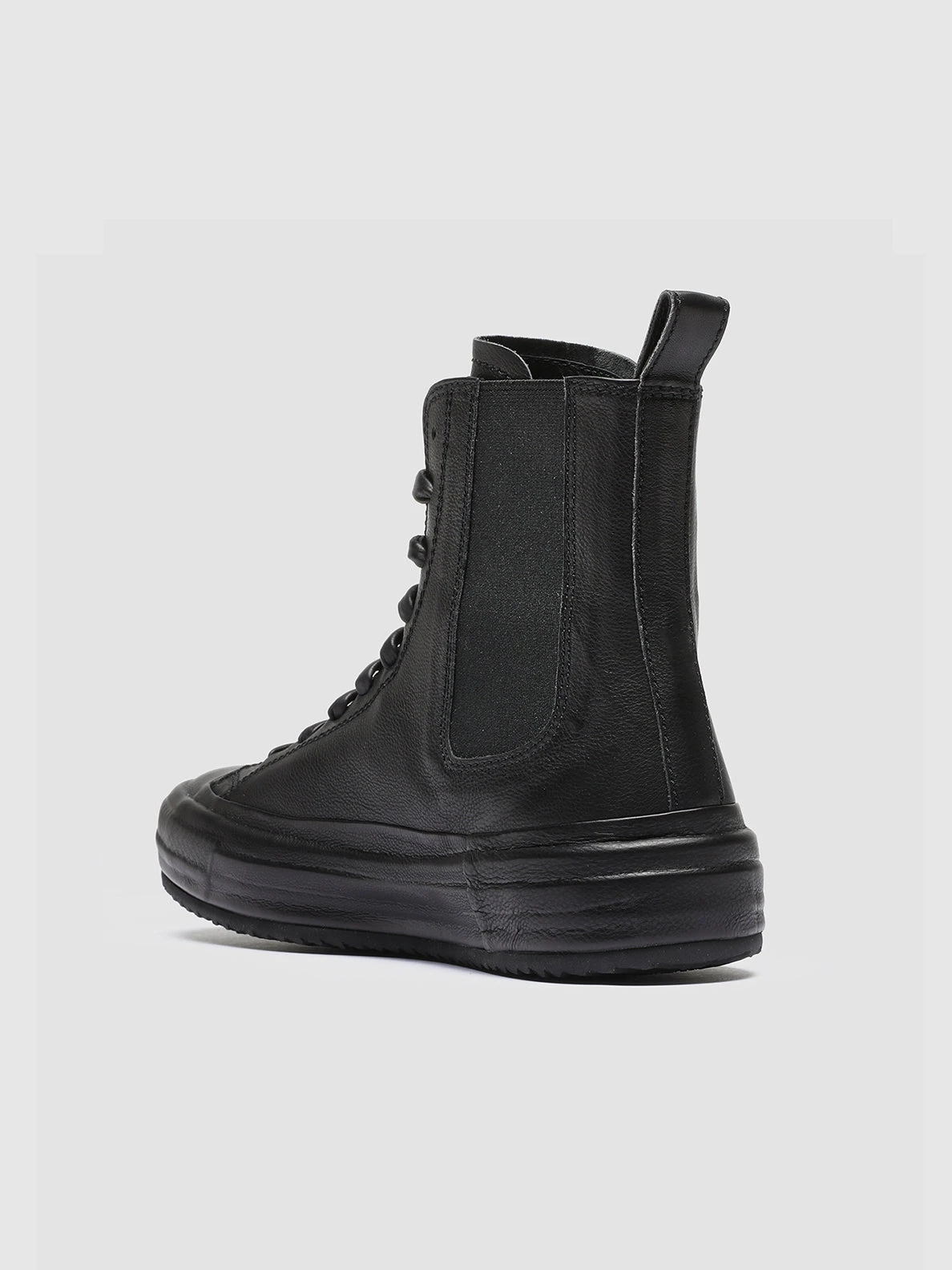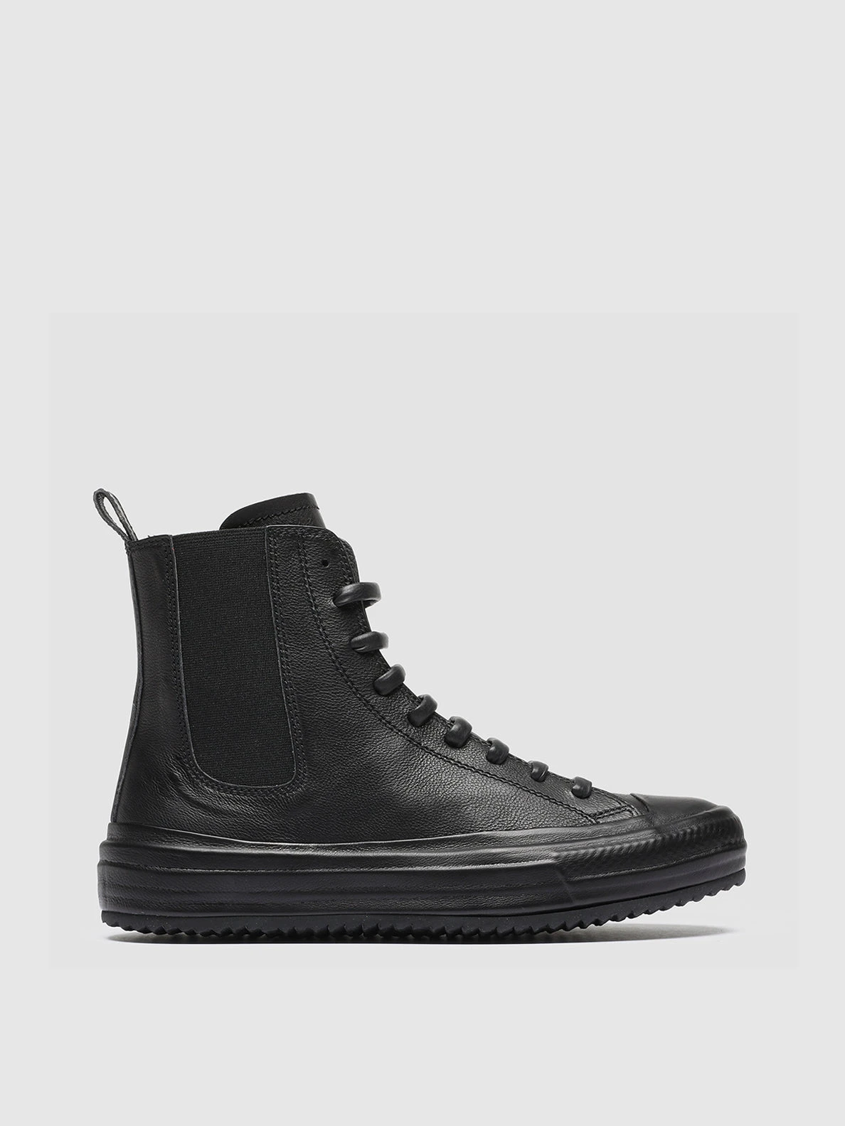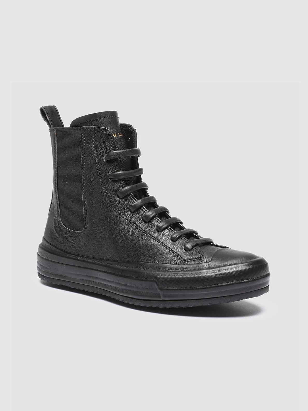 Handcrafted from fine smooth black leather our Mes high-top sneakers reveal a casual and sportswear soul with luxurious touches. They feature comfortable stretch fabric side panels flawless tone-on-tone stitching our gold-tone lettering logo at the tongue leather heel pull tab and a covered rubber sole with a tread bottom.