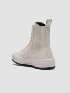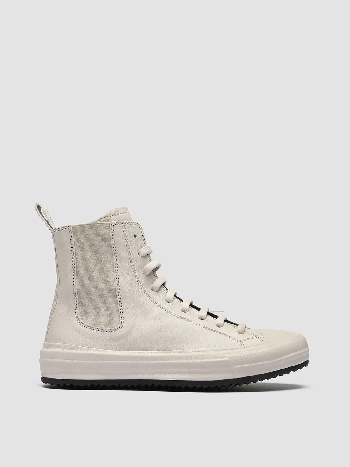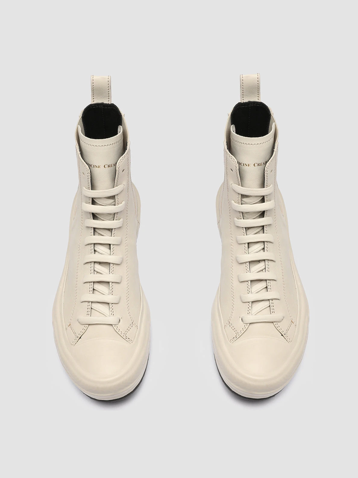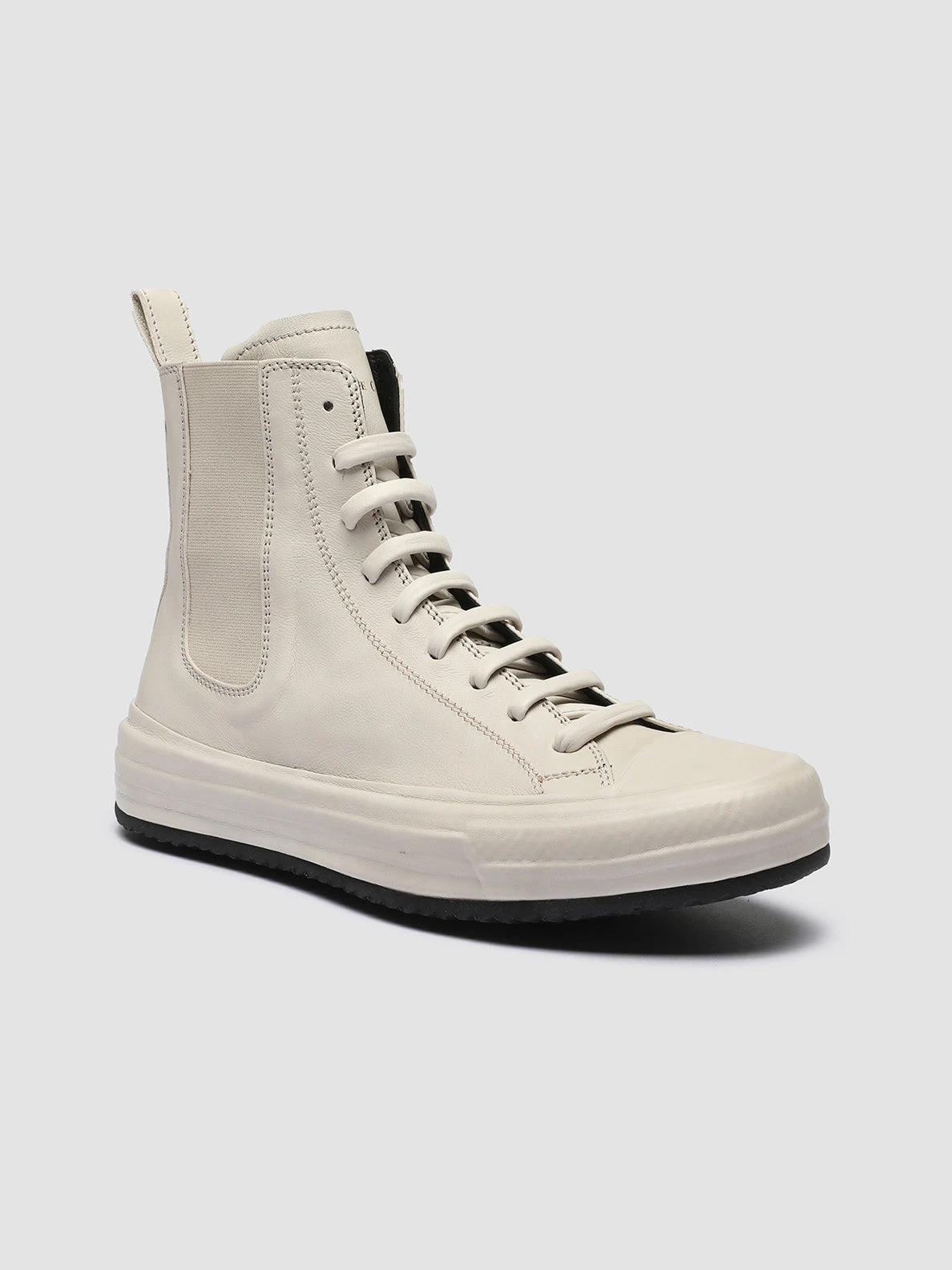 Handcrafted from fine smooth ivory leather our Mes high-top sneakers reveal a casual and sportswear soul with luxurious touches. They feature comfortable stretch fabric side panels flawless tone-on-tone stitching our gold-tone lettering logo at the tongue leather heel pull tab and a covered rubber sole with a tread bottom.