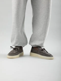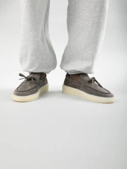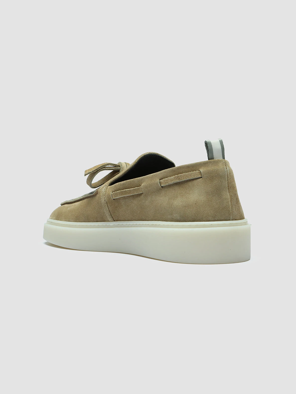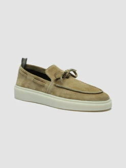 Our handcrafted Muskrat boat loafers feature a white natural rubber sole that adds a sporty and modern twist. They are made from premium tan suede and reveal classic front self-tie straps, rounded toe and signature grosgrain heel loop tab.