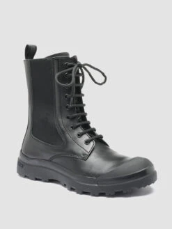 Our comfortable Pallet handcrafted ankle boots reveal a truly eye-catching and contemporary hybrid silhouette. Made from fine black nappa leather they feature front lacing stretch fabric panel on one side and zip fastening on the other tone-on-tone grosgrain heel loop tab rubber cap toe and a chunky Vibram rubber sole.