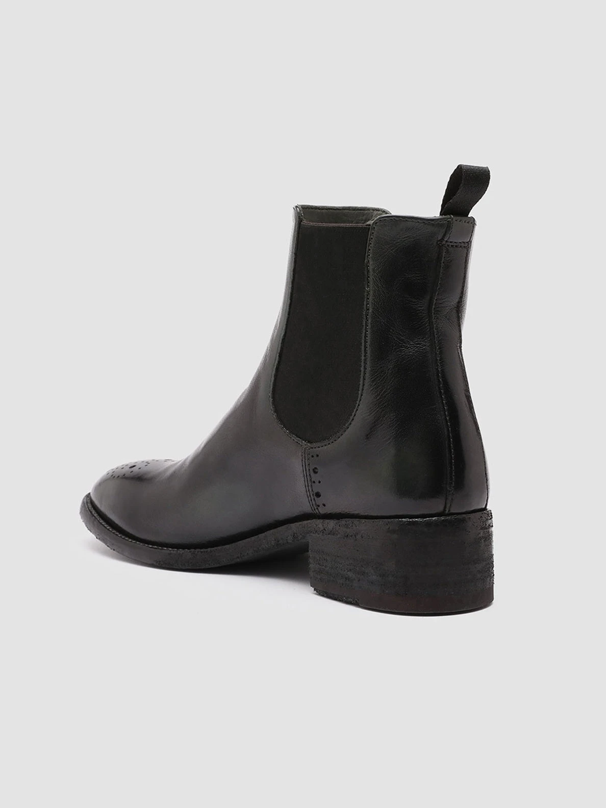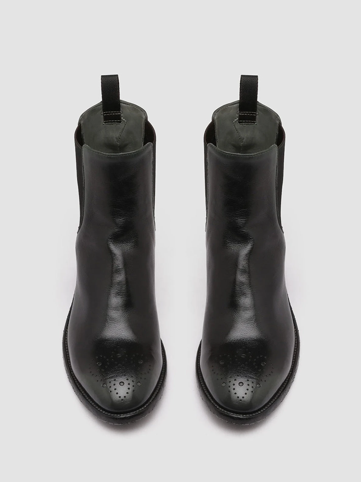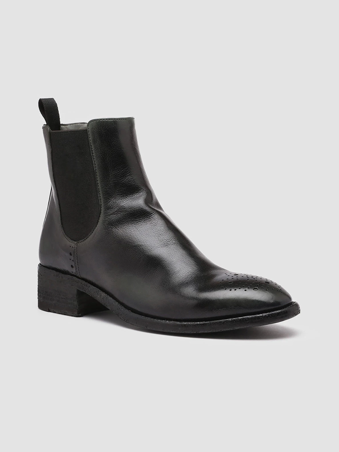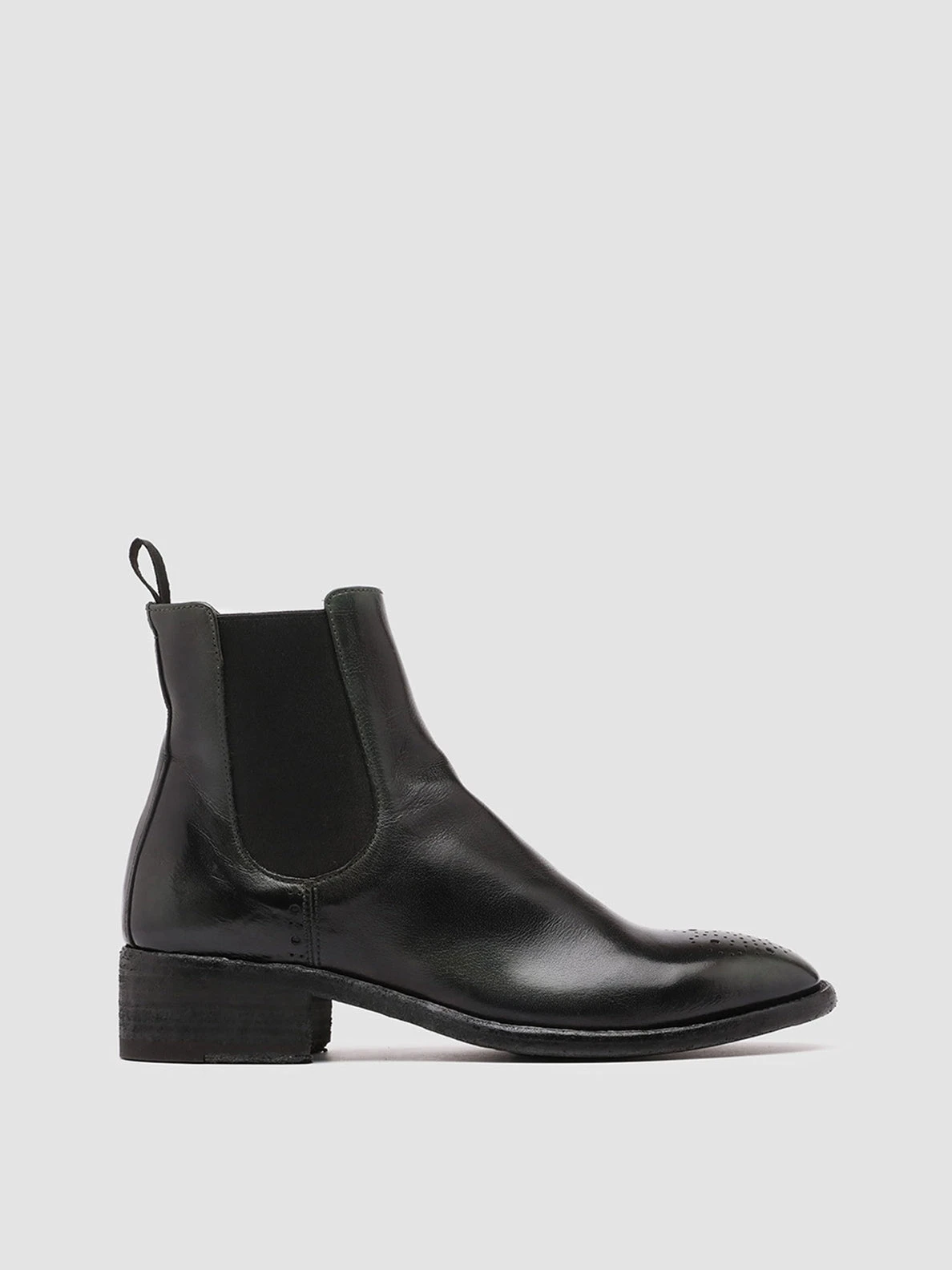 Our artisan Seline Chelsea boots perfectly combine timeless elegance and contemporary comfort. Set on a leather sole with a low stacked heel they have an airbrushed leather upper in a refined black and dark green shade brogue motif at the toe and sides elasticated side accents for a perfect fit and a grosgrain heel pull tab.
