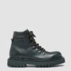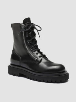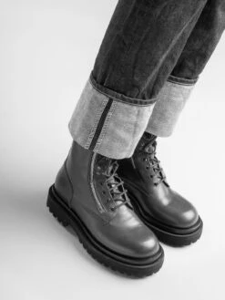 A bold and rock style distinguishes our Ultimatt black full grain leather ankle boots. Made by our skilled craftsmen they set on a tread rubber sole and feature a front closure with laces and a comfortable silver-tone metal zip round toe and tone-on-tone leather back loop tab.