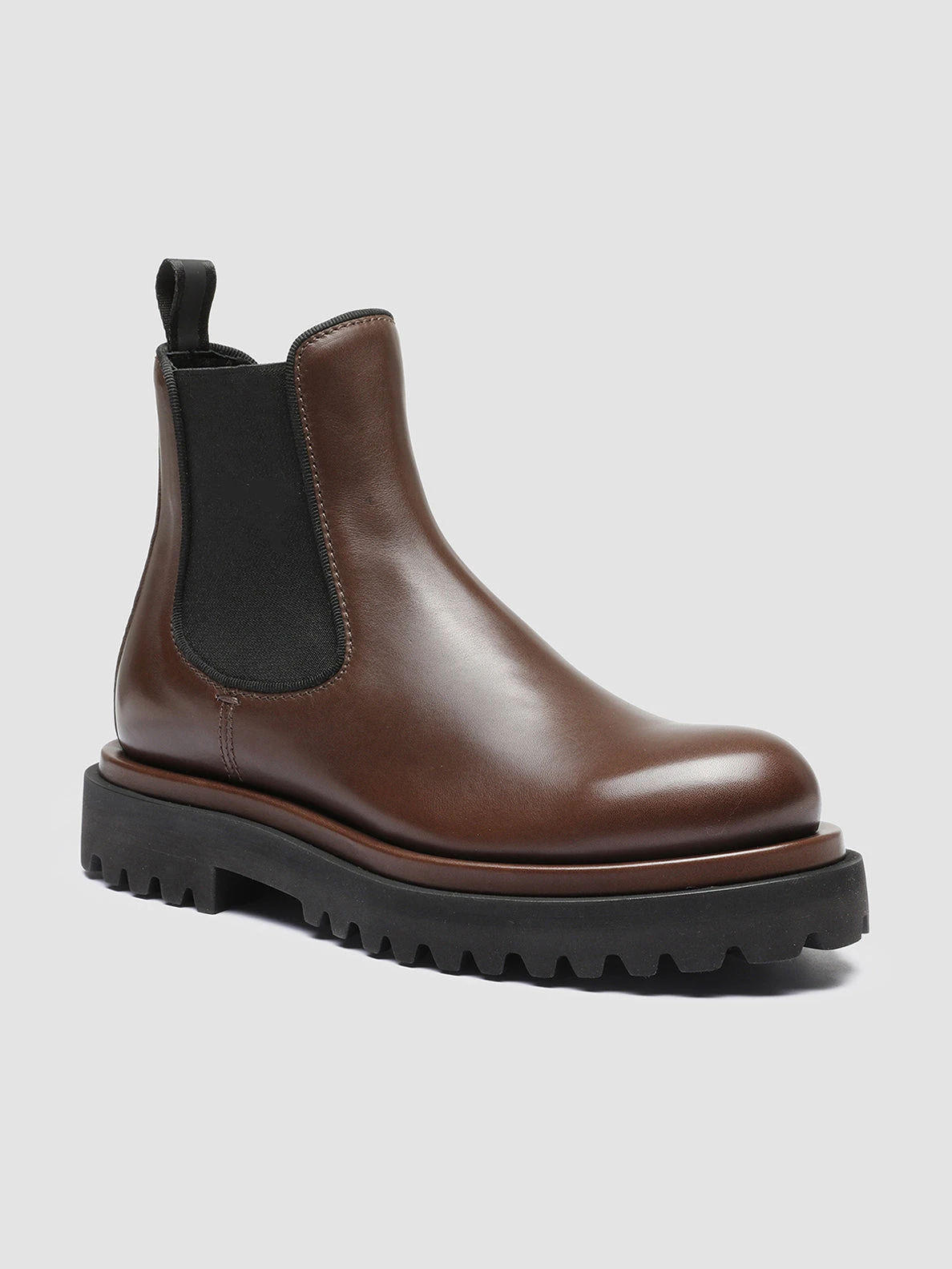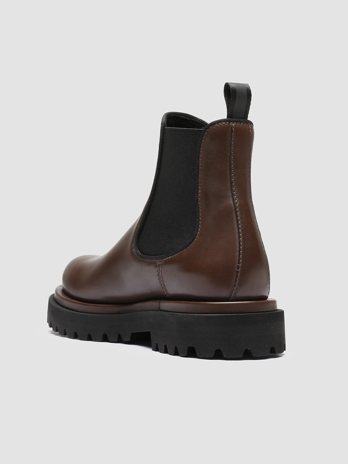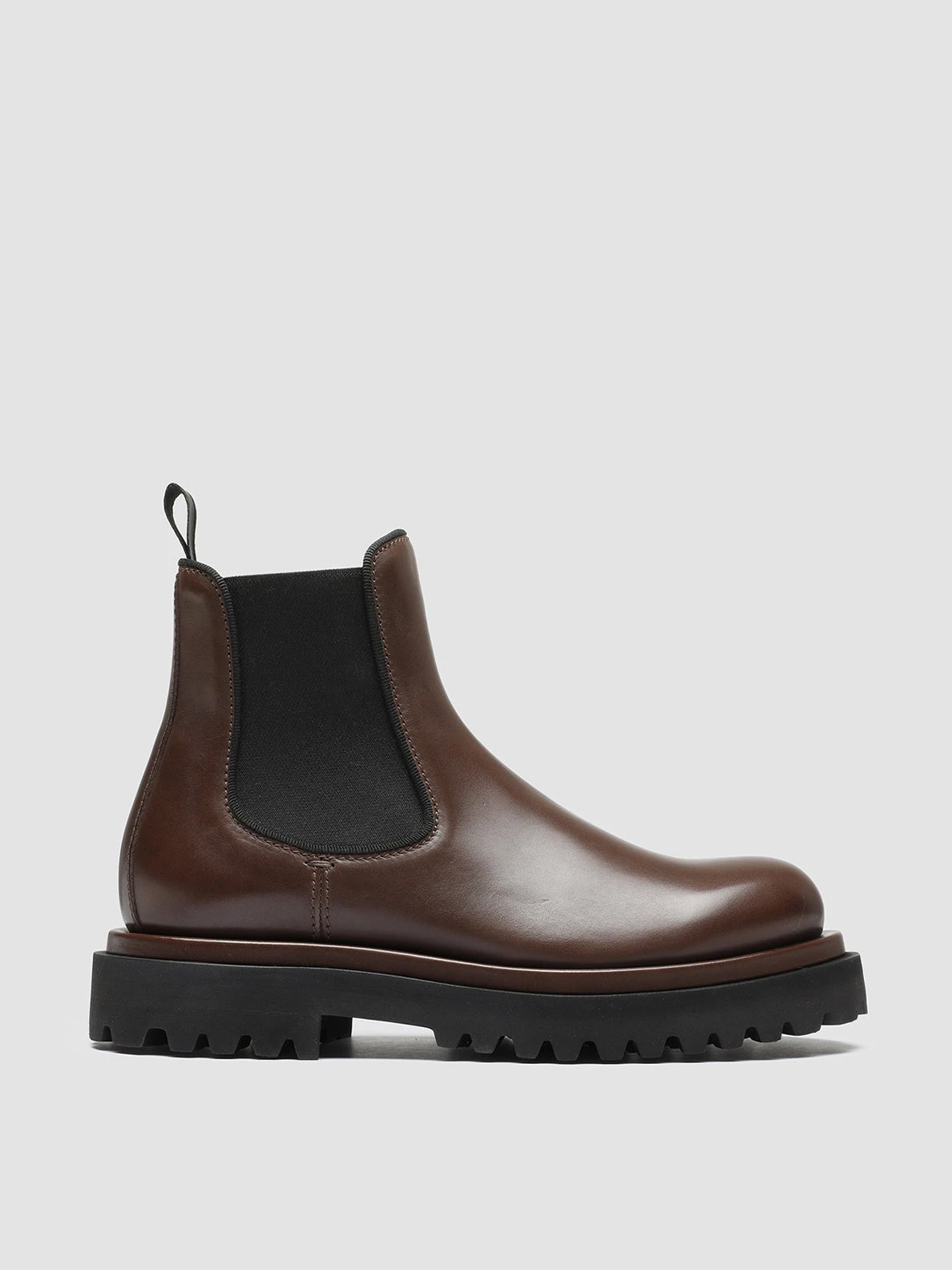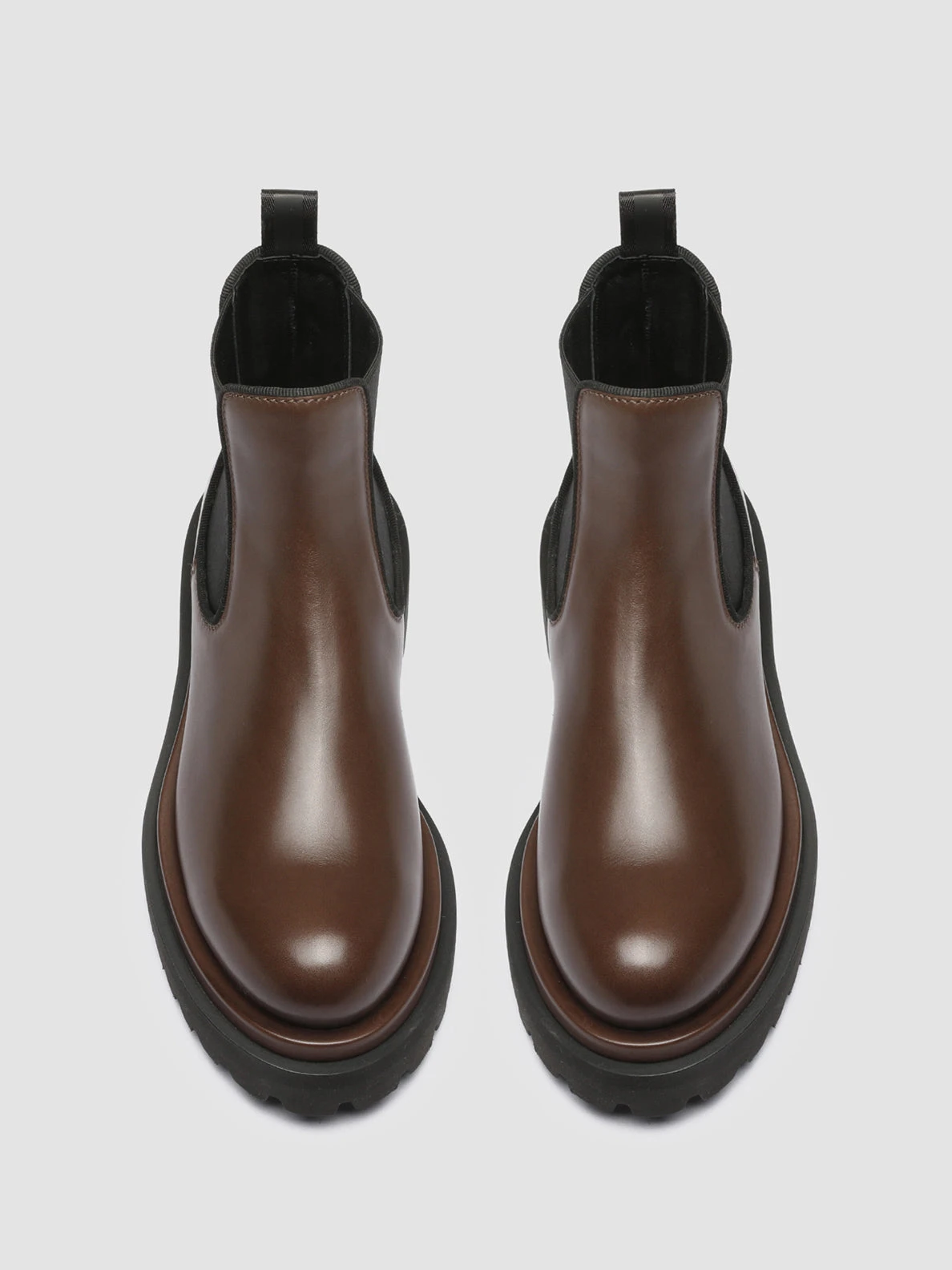 Bold thanks to the chunky black rubber tread sole our Wisal Chelsea boots reveal a contemporary versatile and super comfy design. They are handcrafted from dark brown smooth leather and feature a rounded toe black stretch fabric side accents with tone-on-tone grosgrain piping and signature heel pull tab.